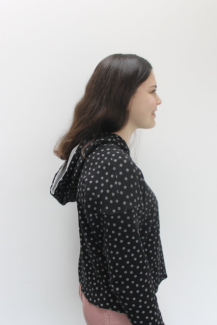 The main reason I was able to make the hoodie with so little fabric was because I used a contrast fabric for the hood lining. To be honest I probably would have done this anyway as I prefer the contrast and I think that the light grey does a good job of breaking up the black too. I like that while it's black the dots make the jumper a bit more interesting and I somehow discovered that I had the perfect shade of grey jersey to match the spots as a leftover fabric from a different project, so I was very pleased about that! The fabric is such lovely quality, it's a medium weight jersey meaning that it's thick enough to hold it's shape and be a bit warmer while also being light enough to hang nicely. I would like to try making the Stella in a really drapey fabric at some point though to see what it looks like.
